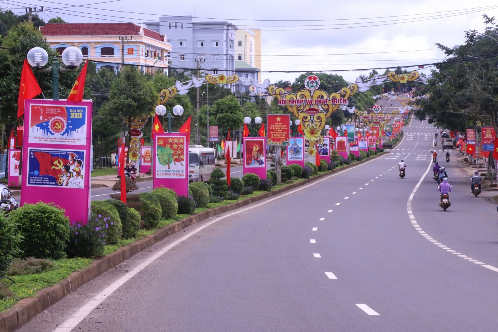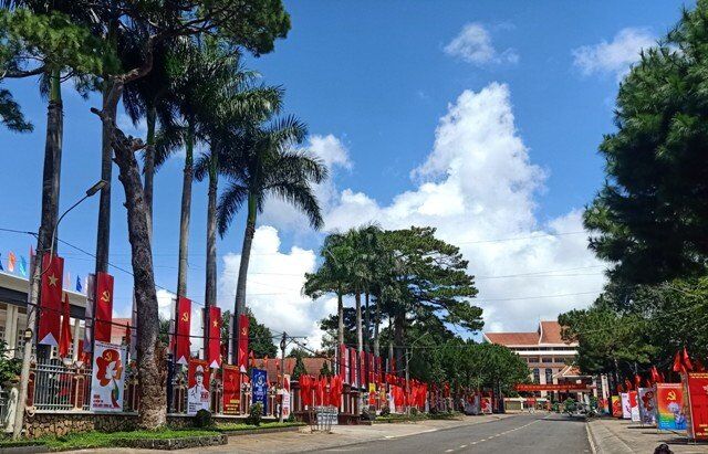 Đường 23/3 thành phố Gia Nghĩa treo nhiều pano, áp phích, cờ hoa tuyên truyền về Đại hội.( Ảnh:Tấn Lê)