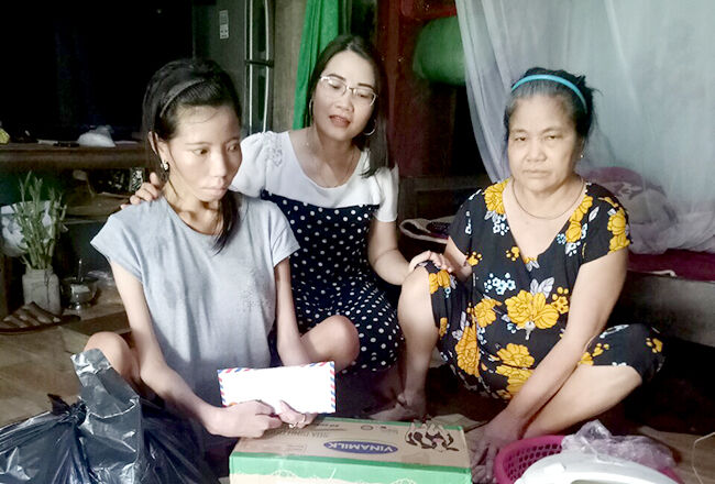 Chị Phan Thị Linh Giang (giữa) - Đại diện Công ty TNHH Thảo mộc Nhân Sơn Dược và chương trình "Hạnh phúc sẻ chia" thăm hỏi, động viên gia đình ông Đinh Việt