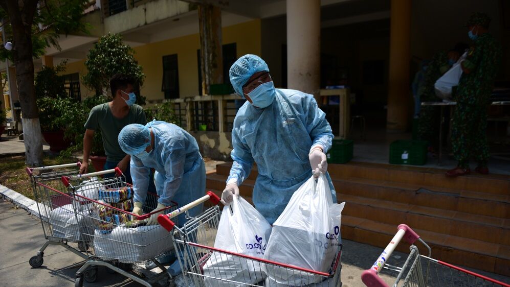 Các cán bộ, chiến sỹ chuẩn bị cơm cho công dân cách ly tại khu cách ly tập trung ở Trường Quân sự Quân khu 7. Ảnh: vietnamnet.vn