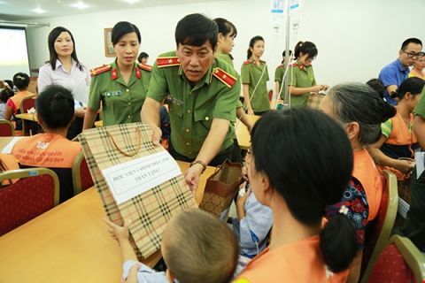 Thiếu tướng, GS.TS Trương Giang Long trực tiếp thăm hỏi và tặng quà cho 40 bệnh nhân nhi có hoàn cảnh khó khăn tại Bệnh viện Truyền máu huyết học Trung ương, năm 2016