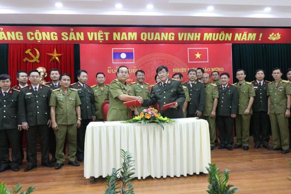 Thiếu tướng, GS.TS Trương Giang Long, GĐ Học viện Chính trị CAND và Đại tá, TS Vi Lay Phét Mi Xay, Hiệu trưởng Trường Lý luận Chính trị, Bộ An ninh Lào ký hợp tác giữa hai đơn vị, năm học 2016 – 2017