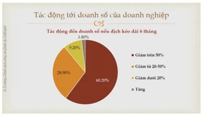 Khảo sát nhanh của Ban nghiên cứu phát triển kinh tế tư nhân đầu tháng 3 vừa qua đối với 1200 doanh nghiệp cho biết nếu như dịch kéo dài 6 tháng thì 60% doanh nghiệp sẽ bị giảm trên 50% doanh thu, gần 30% doanh nghiệp giảm từ 20 đến 50%. Nói cách khác, khoảng 90% doanh nghiệp được khảo sát có mức giảm doanh thu nghiêm trọng và 74% doanh nghiệp đứng trước nguy cơ phá sản, giải thể.