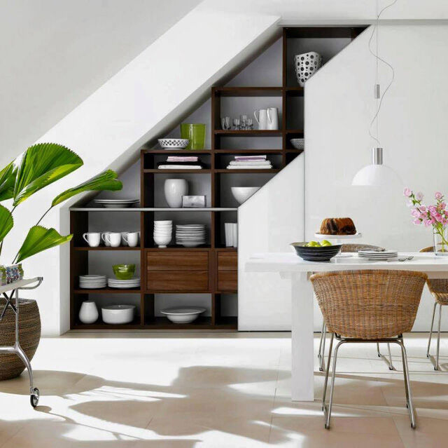 Bạn có thể tận dụng gầm cầu thang, chiều cao của trần nhà với những chiếc kệ, tủ đựng đồ. Điều này giúp bạn sử dụng hết các không gian hiện có trong nhà. Đây là một trong những giải pháp hiệu quả nếu gia đình bạn sở hữu nhiều đồ đạc mà vẫn giữ được sự tiện nghi, gọn gàng cần thiết cho ngôi nhà.