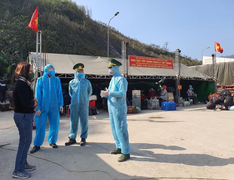 Phóng viên Báo điện tử Đảng Cộng sản Việt Nam (ngoài cùng, bên trái) tác nghiệp về công tác phòng, chống dịch COVID-19 tại cửa khẩu quốc tế cầu treo Hà Tĩnh - (Ảnh: PV)