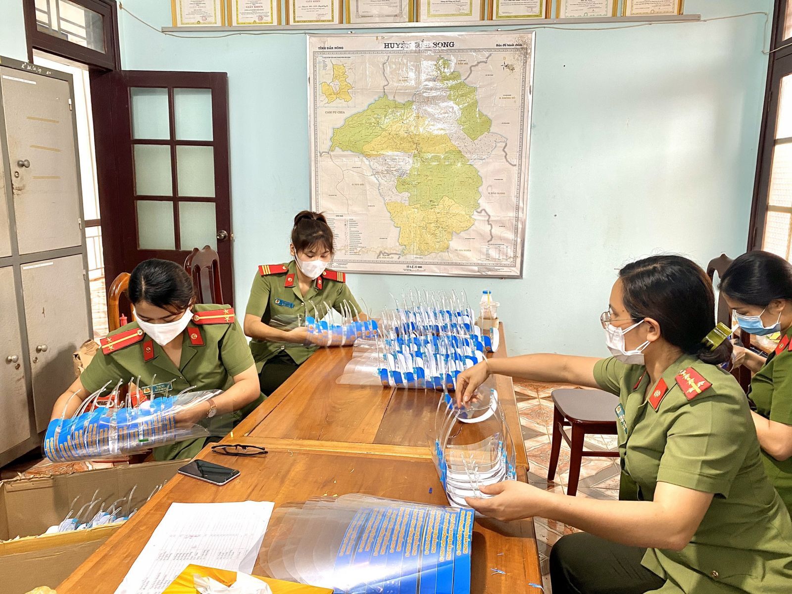 Hội phụ nữ Công an huyện Đắk Song tranh thủ ngoài giờ hành chính làm tấm chắn giọt bắn gửi tặng lực lượng tuyến đầu phòng, chống dịch.