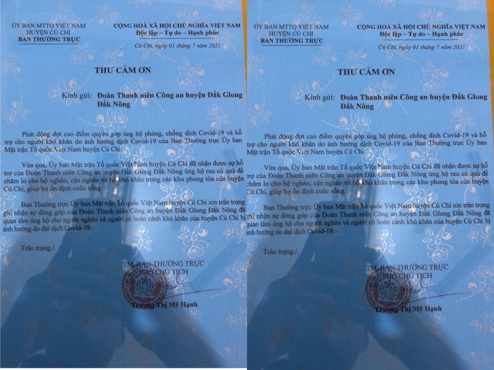 Ủy ban Mặt trận Tổ quốc Việt Nam huyện Củ Chi, Thành phố Hồ Chí Minh gửi thư cảm ơn đến Đoàn thanh niên Công an huyện Đắk Glong.