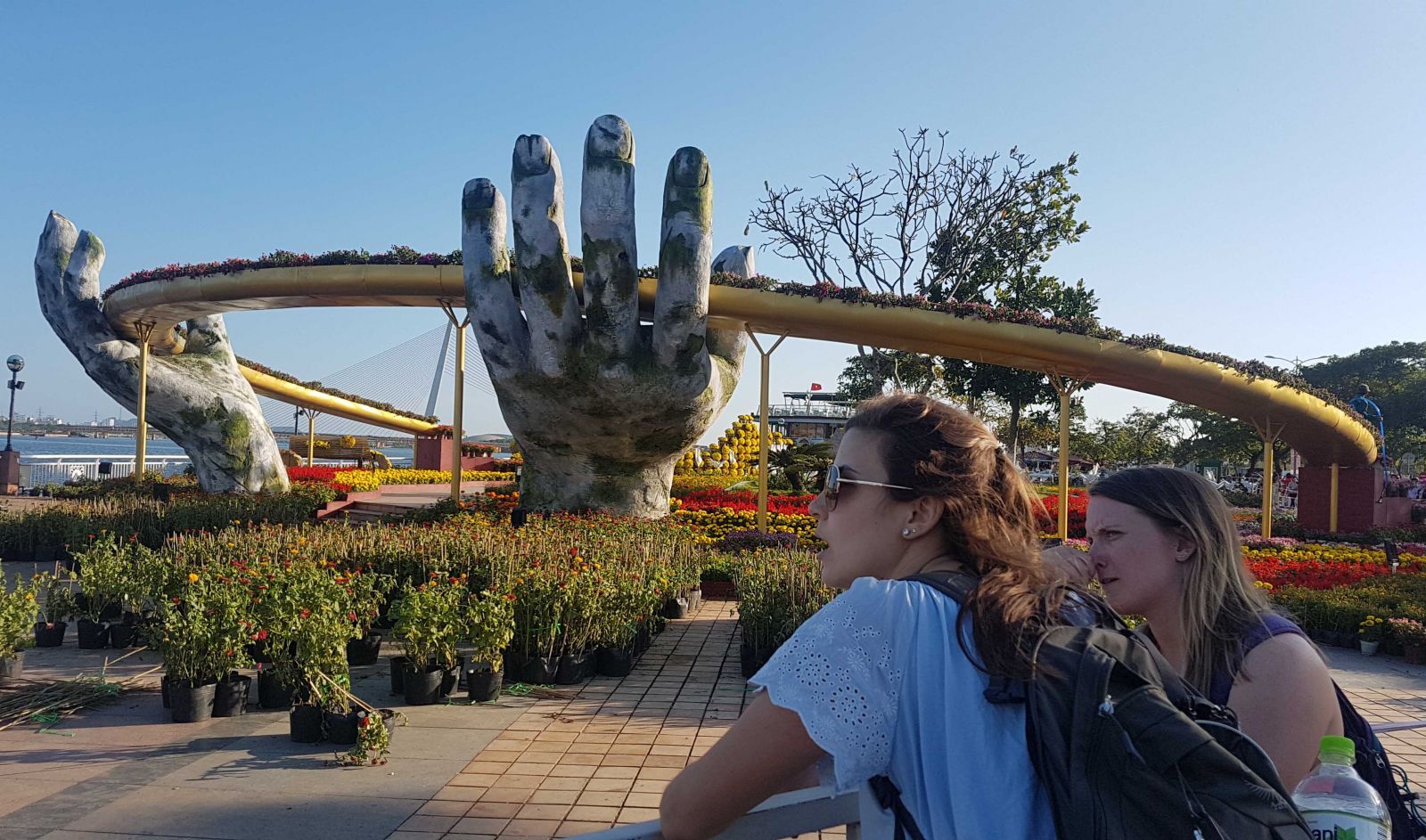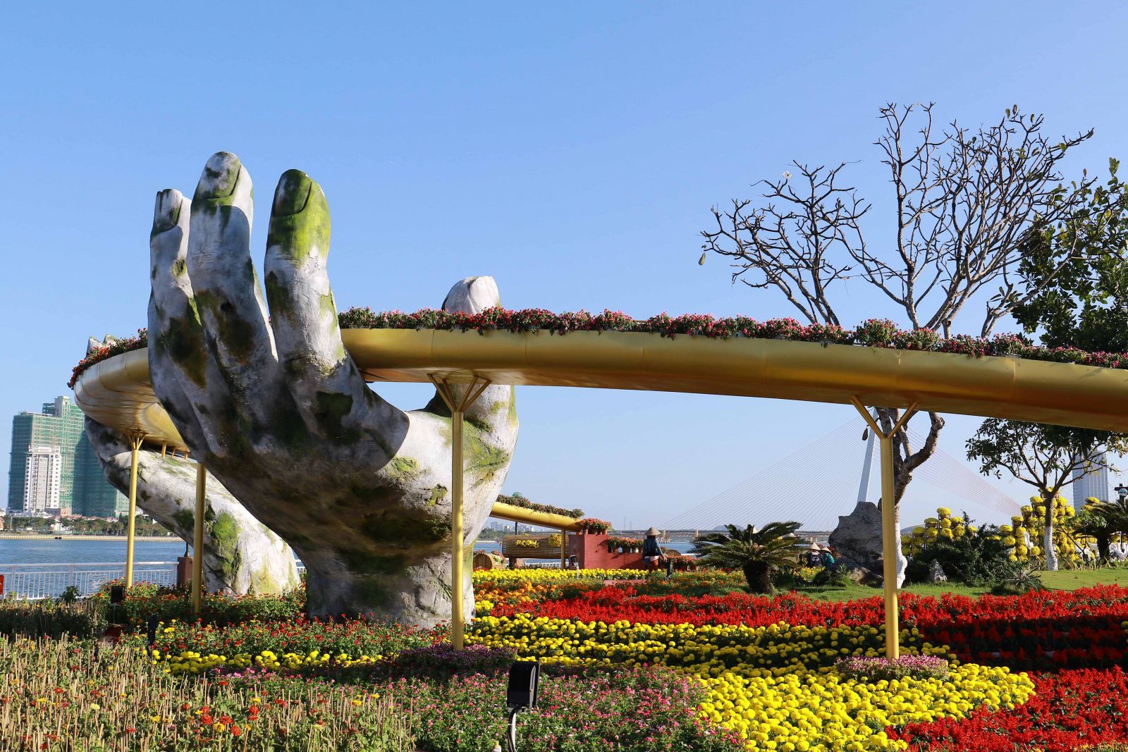 Đó chính là mô hình Cầu Vàng. Năm nay, khi quyết định đưa Cầu Vàng "xuống phố", chúng tôi đã rất tâm đắc với ý tưởng này. Mô hình Cầu Vàng tại Đường hoa Đà Nẵng có kích thước bằng ¼ kích thước cầu thật, với chiều dài 44,5 mét, rộng 1,2 mét. Hai bàn tay nâng đỡ cây cầu cũng được tạo dựng với những dấu rêu phong ấn tượng hệt như cây cầu trên đỉnh Bà Nà tại Sun World Ba Na Hills.