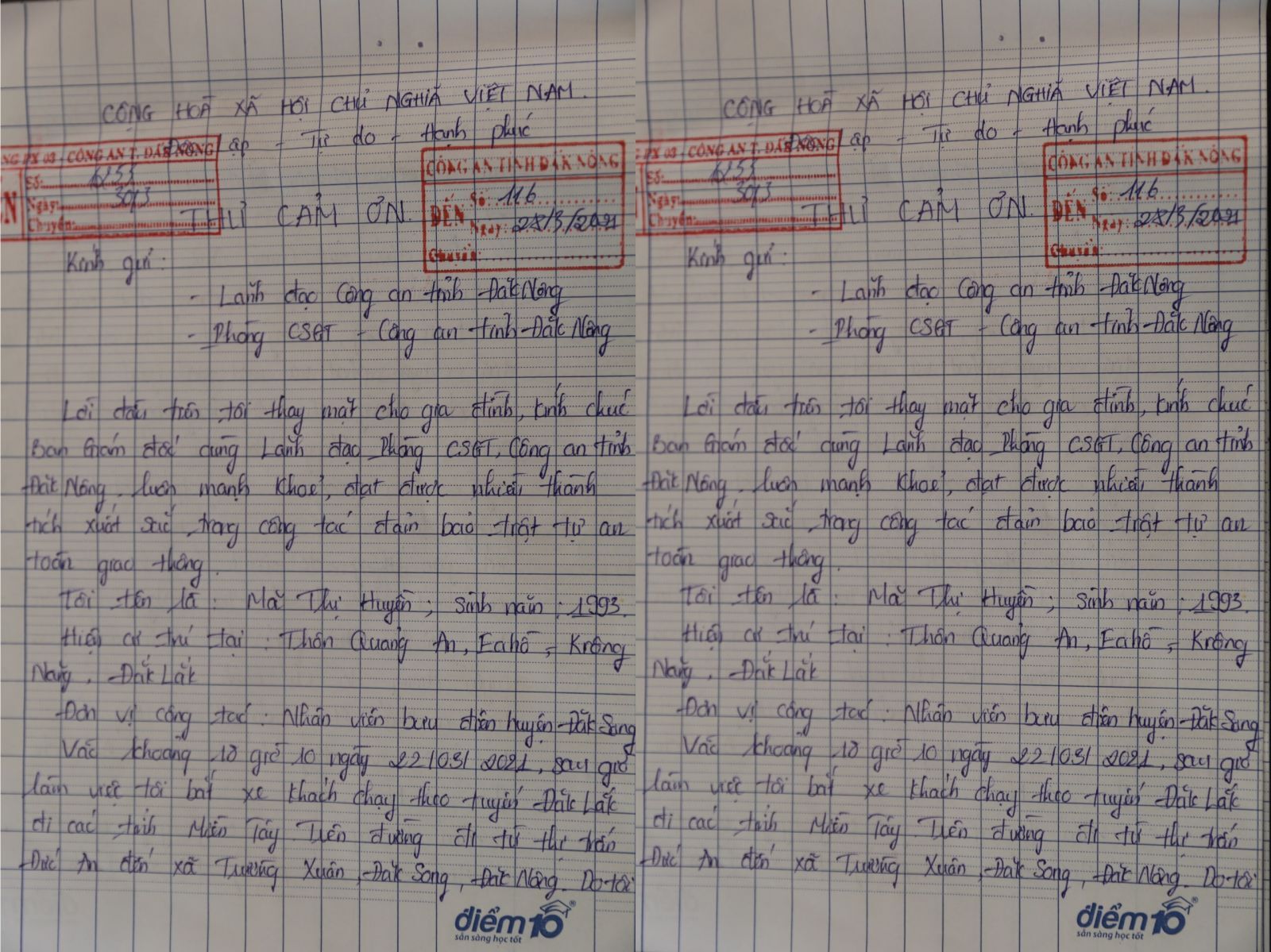 Lá thư cảm ơn của bà Hoàng Thị Oanh và Thư cảm ơn của chị Huyền gửi đến CBCS công an Đắk Nông.