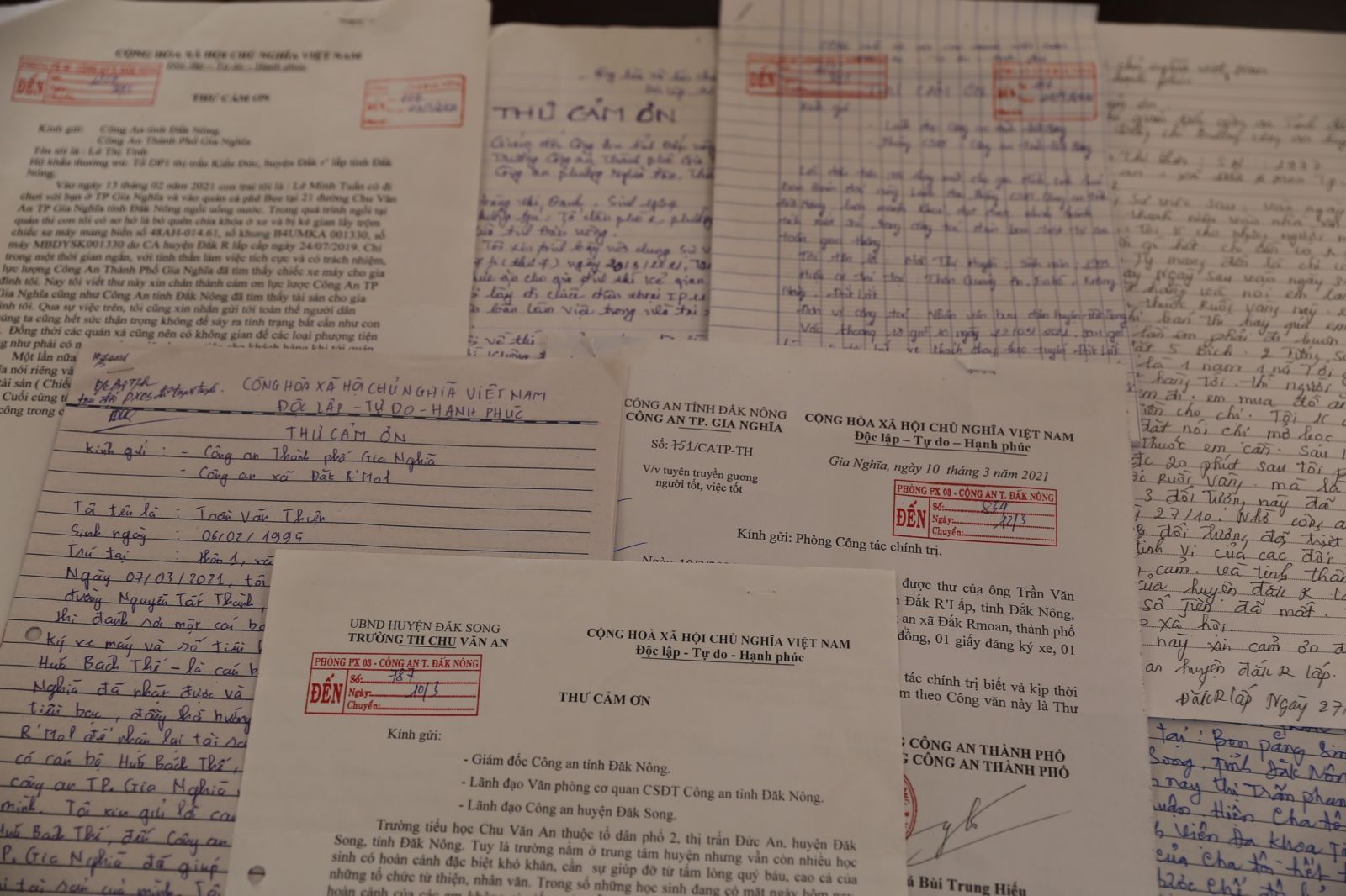 Từ đầu năm 2021 đến nay, đồng chí Giám đốc Công an tỉnh Đắk Nông và thủ trưởng Công an các đơn vị, địa phương trong tỉnh liên tiếp nhận được hơn 50 lá thư cảm ơn của người dân trong và ngoài tỉnh gửi đến bày tỏ lòng cảm phục trước tinh thần tận tụy với công việc; mưu trí, sáng tạo, kiên quyết trong đấu tranh với tội phạm và trước những việc làm ý nghĩa, nhân văn của CBCS Công an Đắk Nông. Có những lá thư được đánh máy cẩn thận, có những lá thư viết tay nắn nót dài nhiều trang, có nhiều lá thư viết vội với những nét chữ chưa được đẹp. Mỗi lá thư là một câu chuyện cảm động về người chiến sĩ Công an Đắk Nông vì nhân dân phục vụ và hơn cả là sự biết ơn, cảm kích, là niềm tin mà người dân gửi gắm vào lực lượng Công an đang ngày đêm tận tụy cống hiến sức lực, trí lực của mình để bảo vệ cuộc sống bình yên, hạnh phúc cho nhân dân.
