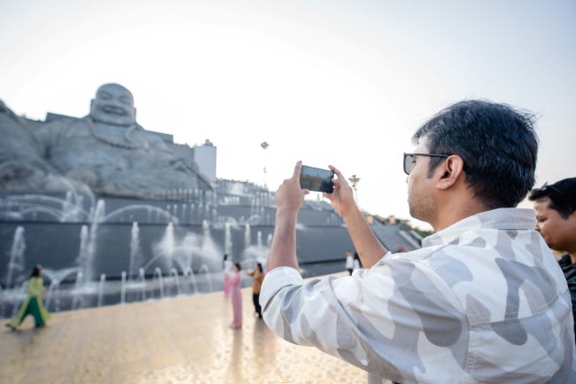 Du khách Ấn Độ chụp ảnh kỷ niệm Tượng Bồ Tát Di Lặc.