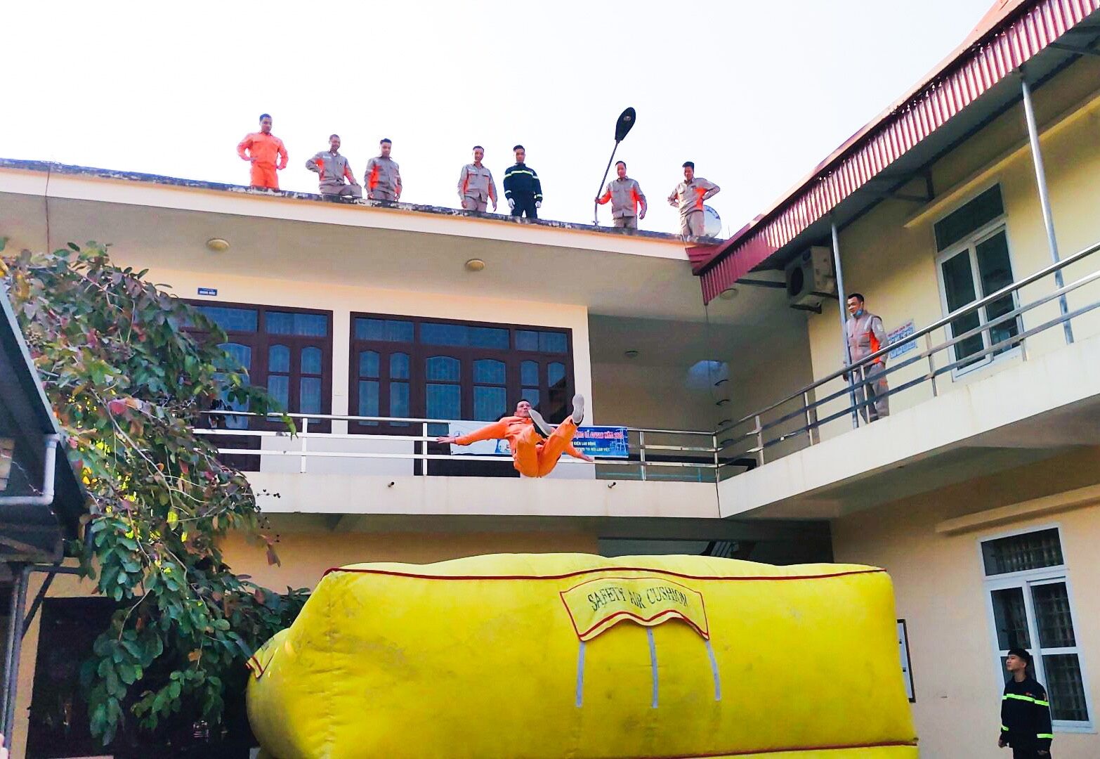Các học viên thực hành cách thoát hiểm bằng đệm hơi