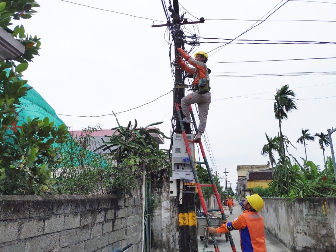Công nhân Điện lực Trực Ninh (PC Nam Định) thực hiện chỉnh trang lưới điện