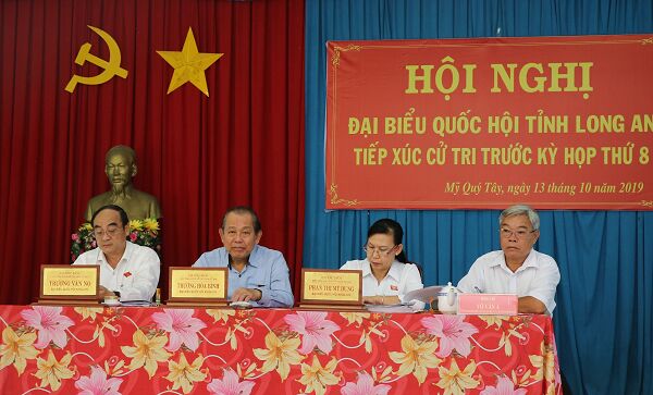 VNHN - Ngày 13/10, Ủy viên Bộ Chính trị, Phó Thủ tướng Thường trực Chính phủ Trương Hòa Bình cùng đoàn đại biểu Quốc hội tỉnh Long An tiếp xúc cử tri 4 xã (Mỹ Quý Tây, Mỹ Quý Đông, Mỹ Thạnh Tây, Mỹ Thạnh Bắc) thuộc huyện Đức Huệ và 3 xã (Thạnh Hòa, Thạnh Lợi, Bình Đức) huyện Bến Lức.