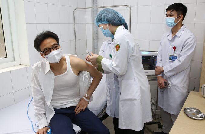Sáng 26-3, Phó Thủ tướng Vũ Đức Đam đã tiêm mũi 2 vắc-xin Nano Covax tại Học viện Quân y. Đây là vắc-xin Covid-19 đầu tiên do Việt Nam nghiên cứu, sản xuất. Trong quá trình này, ông trò chuyện vui vẻ với cán bộ y tế.