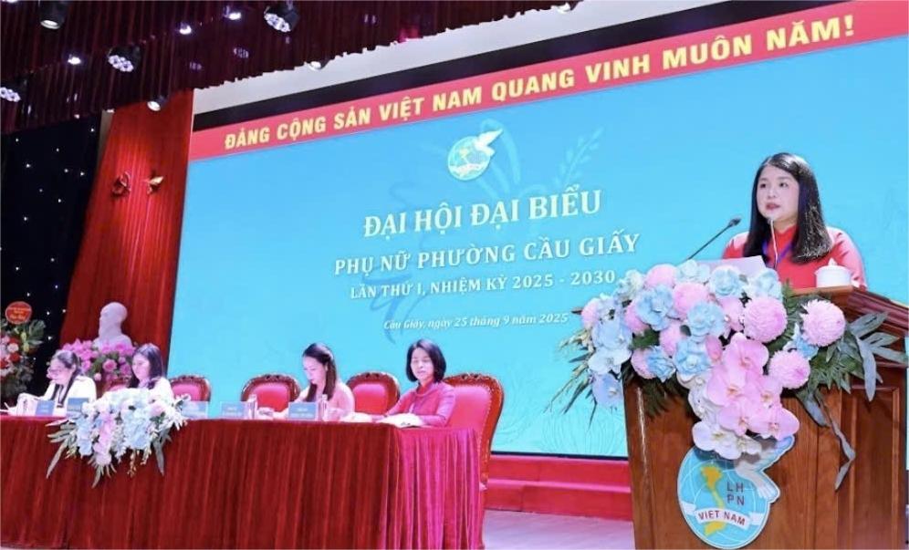 Ngay từ sáng sớm, khu vực hội trường rực rỡ cờ hoa, tràn ngập bầu không khí phấn khởi, tự hào. Đại hội vinh dự đón tiếp các đồng chí lãnh đạo Hội LHPN Thành phố Hà Nội, lãnh đạo Đảng ủy – HĐND – UBND – Ủy ban MTTQ phường, cùng các đại biểu khách quý, nguyên cán bộ Hội qua các thời kỳ. Đặc biệt, 167 đại biểu chính thức, đại diện cho hơn 4.190 hội viên phụ nữ phường Cầu Giấy, đã có mặt đông đủ, thể hiện trí tuệ, bản lĩnh và khát vọng phát triển mạnh mẽ trong thời kỳ mới. Trong nhiệm kỳ vừa qua, Hội LHPN phường Cầu Giấy đã phát huy mạnh mẽ tinh thần đoàn kết, chủ động và sáng tạo, góp phần tích cực vào sự phát triển kinh tế – xã hội của địa phương. Nhiều mô hình, hoạt động thiết thực được triển khai sâu rộng, thu hút đông đảo hội viên tham gia như: “Phụ nữ giúp nhau phát triển kinh tế” góp phần hỗ trợ hàng chục hộ gia đình thoát nghèo bền vững; “Tuyến phố văn minh – sạch đẹp”, “Gia đình 5 không 3 sạch” được duy trì thường xuyên, xây dựng môi trường sống an toàn, xanh – sạch – đẹp; các lớp tập huấn về chuyển đổi số, kỹ năng sống, khởi nghiệp và pháp luật được tổ chức đều đặn, nâng cao tri thức cho phụ nữ; công tác chăm lo trẻ em, gia đình chính sách, hỗ trợ khởi nghiệp được chú trọng, khơi dậy tinh thần tự tin, bản lĩnh, sáng tạo trong hội viên. Những kết quả nổi bật trên đã góp phần quan trọng vào việc thực hiện thắng lợi Nghị quyết Đại hội Đảng bộ phường Cầu Giấy nhiệm kỳ 2020 – 2025, tạo nền tảng vững chắc cho giai đoạn phát triển tiếp theo. Phát biểu chỉ đạo tại Đại hội, đại diện Hội LHPN Thành phố Hà Nội biểu dương những thành tích xuất sắc của phụ nữ phường Cầu Giấy trong nhiệm kỳ vừa qua. Đồng thời, đồng chí đề nghị Hội tiếp tục phát huy truyền thống đoàn kết, đổi mới nội dung và phương thức hoạt động, gắn bó chặt chẽ với nhu cầu thực tiễn của hội viên, góp phần xây dựng tổ chức Hội ngày càng vững mạnh.