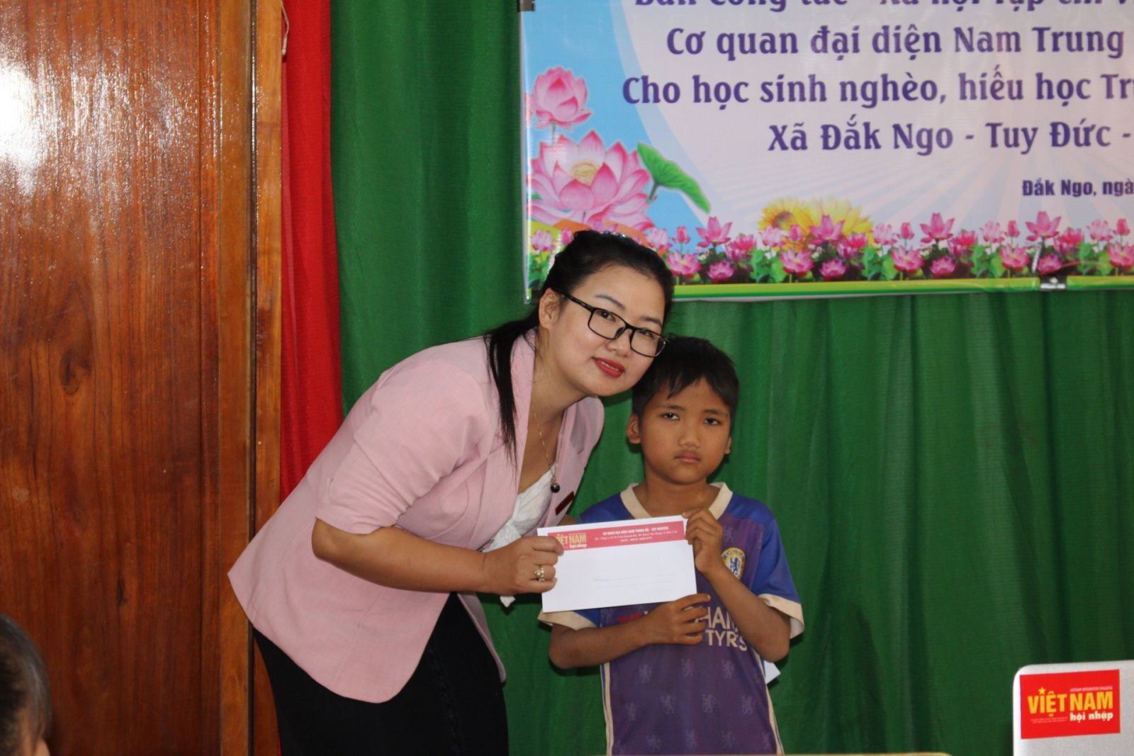 Nhà báo Nguyễn Thị Hương – Lãnh đạo cơ quan đại diện Nam Trung Bộ - Tây Nguyên Tạp chí Việt Nam Hội nhập cho biết: Đây là lần thứ 02 bà trở lại ngôi trường, tuy trường đã được xây khang trang hơn so với lần đầu tiên bà đến thăm nhưng hoàn cảnh các em học sinh nơi đây vẫn còn nhiều khó khăn, nhiều thầy cô tại trường cũng còn vất vả. Quỹ học bổng Việt Nam Hội Nhập mới được thành lập nên nguồn kinh phí hoạt động vẫn còn hạn chế, vì vậy chúng tôi chỉ có thể gửi tặng những suất học bổng, phần quà nhỏ để động viên đến thầy cô giáo cũng như các em học sinh tại trường.