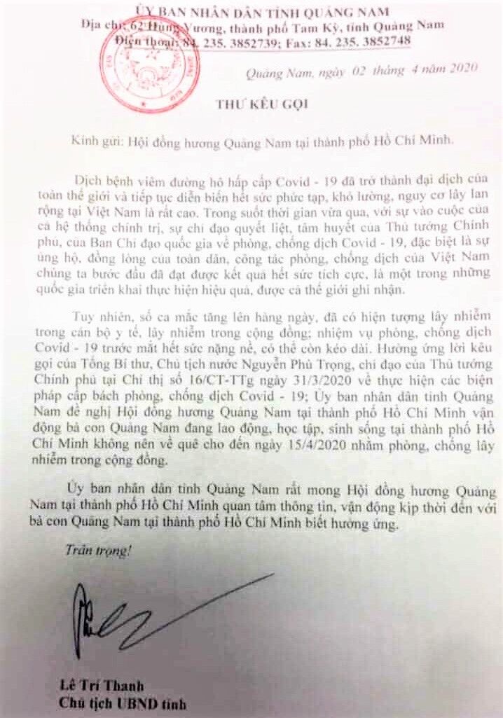 Lãnh đạo tỉnh Quảng Nam cũng hứa sẽ hỗ trợ người ở lại TP HCM, Hà Nội đang gặp khó khăn và nhắn người dân trong tỉnh ai gặp khó thì liên hệ với Hội đồng hương. Tỉnh Quảng Nam khẳng định những người từ 2 địa phương trên về quê sau ngày 1-4 là vi phạm pháp luật.