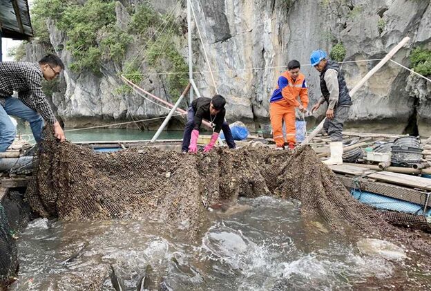 Thu hoạch cá song nuôi tại thị trấn Cái Rồng, huyện Vân Đồn. Ảnh: Thanh Tùng
