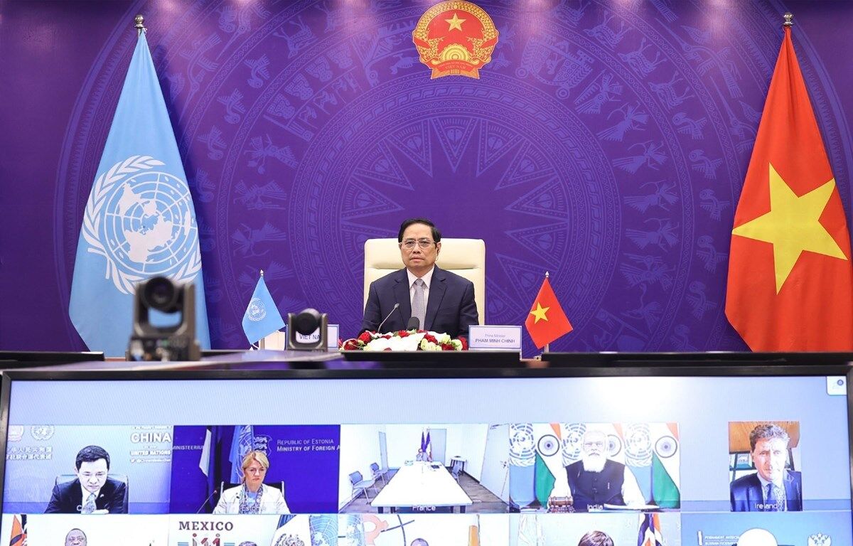 Thủ tướng Phạm Minh Chính phát biểu tại Phiên thảo luận mở Cấp cao của Hội đồng Bảo an Liên hợp quốc. (Ảnh: Dương Giang/TTXVN)