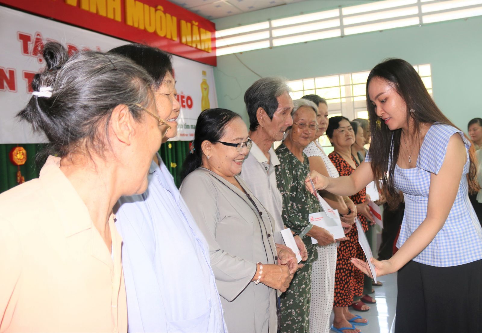 Bà Lê Thị Nguyệt Thu - Chủ tịch Tập đoàn Sao Mai tặng quà tại Trung tâm giáo dục trẻ mồ côi và người già neo đơn TP. Long Xuyên.