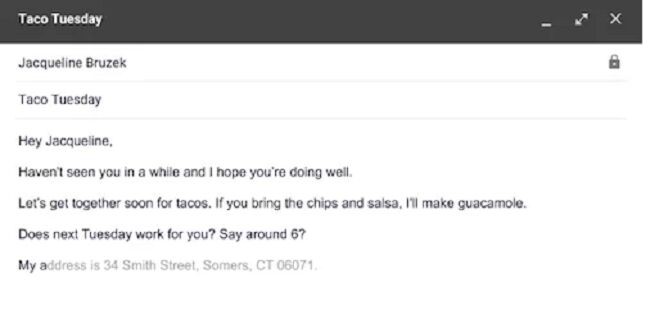 Chẳng hạn, khi hẹn ai đó ở một nhà hàng, Smart Compose sẽ gợi ý luôn địa chỉ nhà hàng để bạn chọn mà không phải gõ cả một địa chỉ dài. Hay dựa vào địa chỉ email, Smart Compose đã biết bạn đang gửi thư cho ai, vì thế ngay khi bạn gõ "Hi" (Chào), tính năng này sẽ tự động điền tên người nhận.