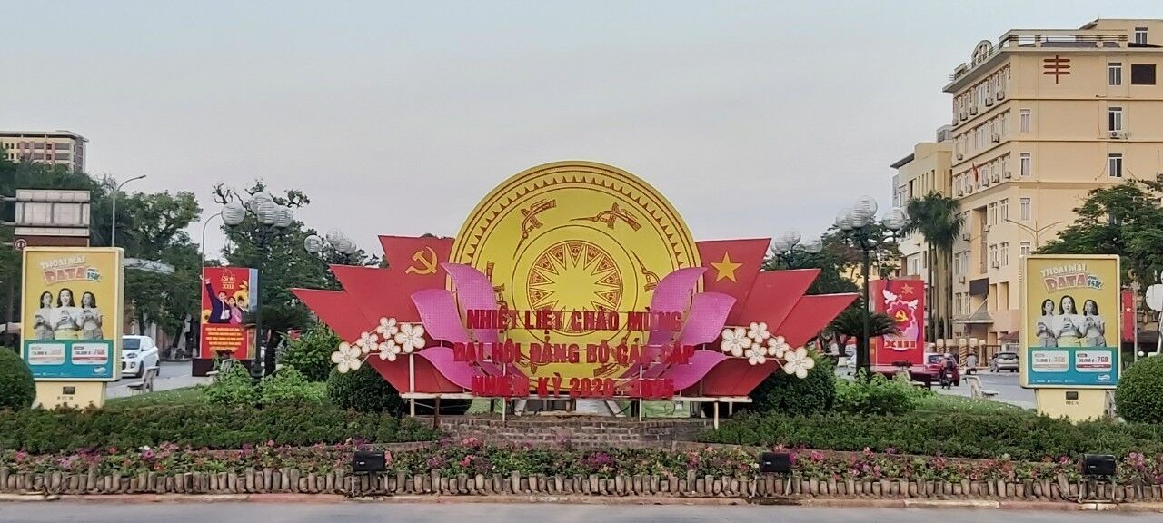 Các trục chính tại các tuyến phố rực đỏ cờ hoa, băng rôn, khẩu hiệu chào mừng Đại hội đại biểu Đảng bộ các cấp