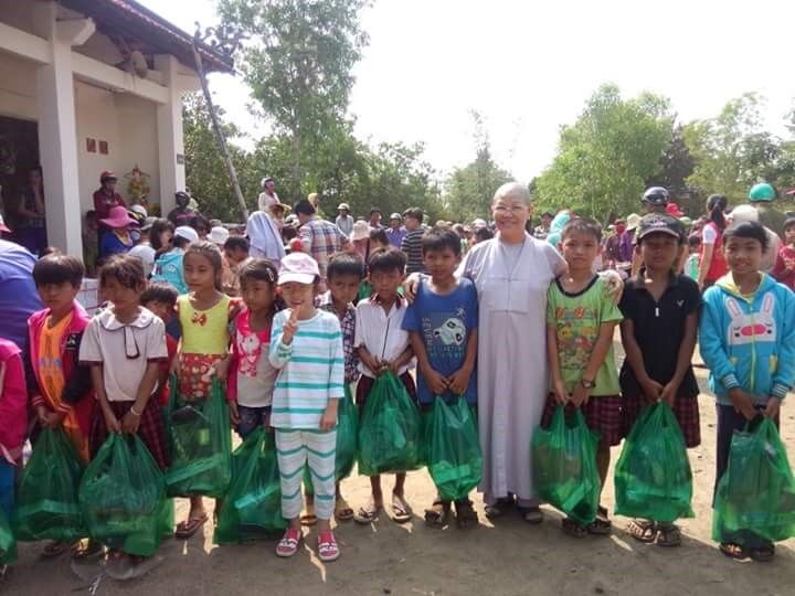 Sư cô Thích Nữ Huệ Thắng tặng quà hỗ trợ các cháu học sinh nghèo vượt khó.