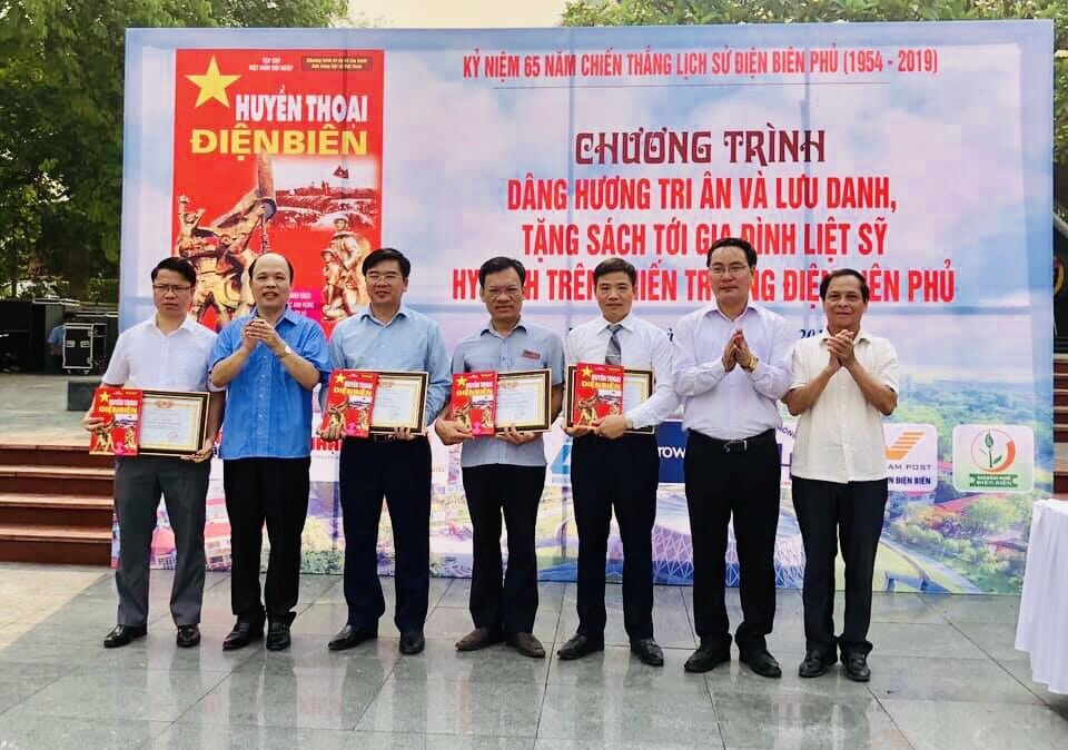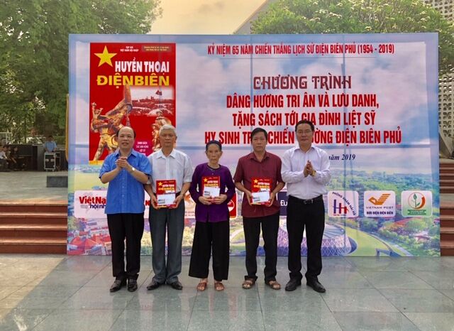 Đại diện BTC tặng sách và quà cho đại diện các gia đình thân nhân AHLS Điện Biên Phủ