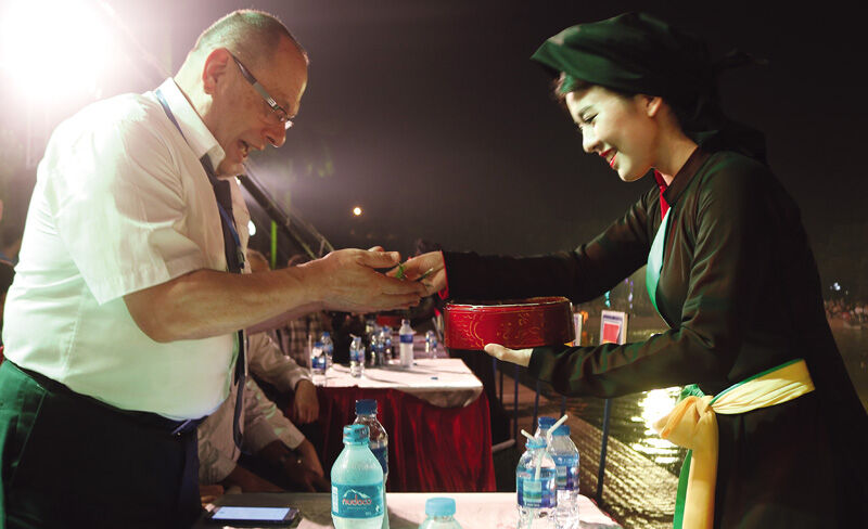 Quan họ mời trầu du khách quốc tế trong chương trình biểu diễn Dân ca Quan họ trên thuyền tại hồ Nguyên Phi Ỷ Lan.