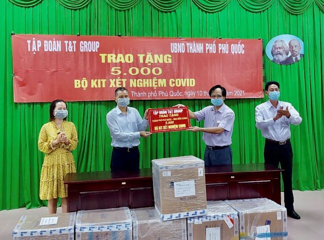 Cũng trong ngày 10/8, tại thành phố Phú Quốc (tỉnh Kiên Giang), đại diện Tập đoàn T&T Group đã trao tặng 5.000 bộ kit xét nghiệm COVID-19 (giá trị tương đương khoảng 1 tỷ đồng) cho đại diện lãnh đạo UBND thành phố Phú Quốc, “tiếp sức” cho các lực lượng chức năng trong công tác rà soát, truy vết, xét nghiệm nhanh COVID-19.