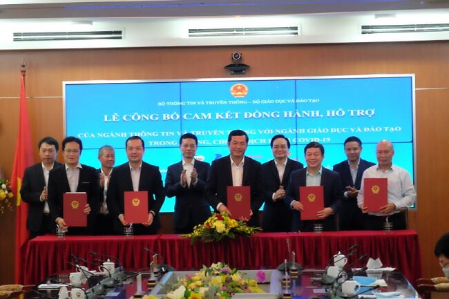 Lễ công bố cam kết đồng hành, hỗ trợ của ngành TT&TT với ngành GD&ĐT trong bối cảnh dịch bệnh COVID-19 diễn biến phức tạp vừa diễn ra tại Bộ TT&TT ngày 26/3.