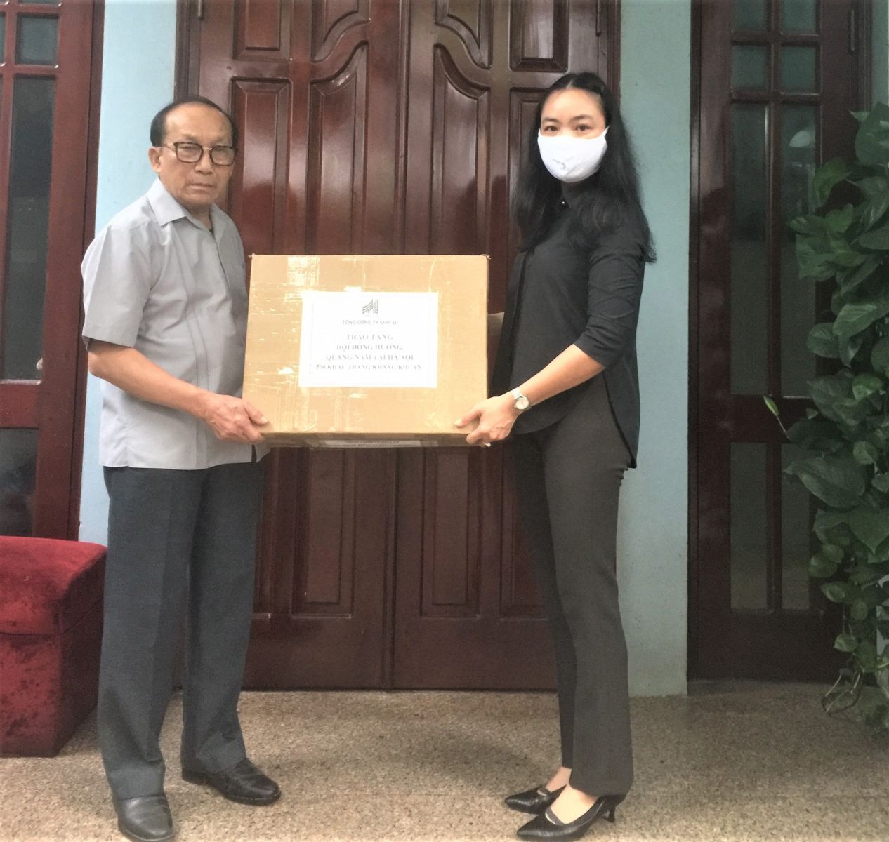 Chị Vũ Hoài Phương, đồng hương Duy Xuyên tại Hà Nội trao 500 khẩu trang cho Thiếu tướng, Anh hùng LLVT nhân dân Nguyễn Văn Trí, Trưởng BLL Đồng hương Quảng Nam tại Hà Nội để chuyển về quê.