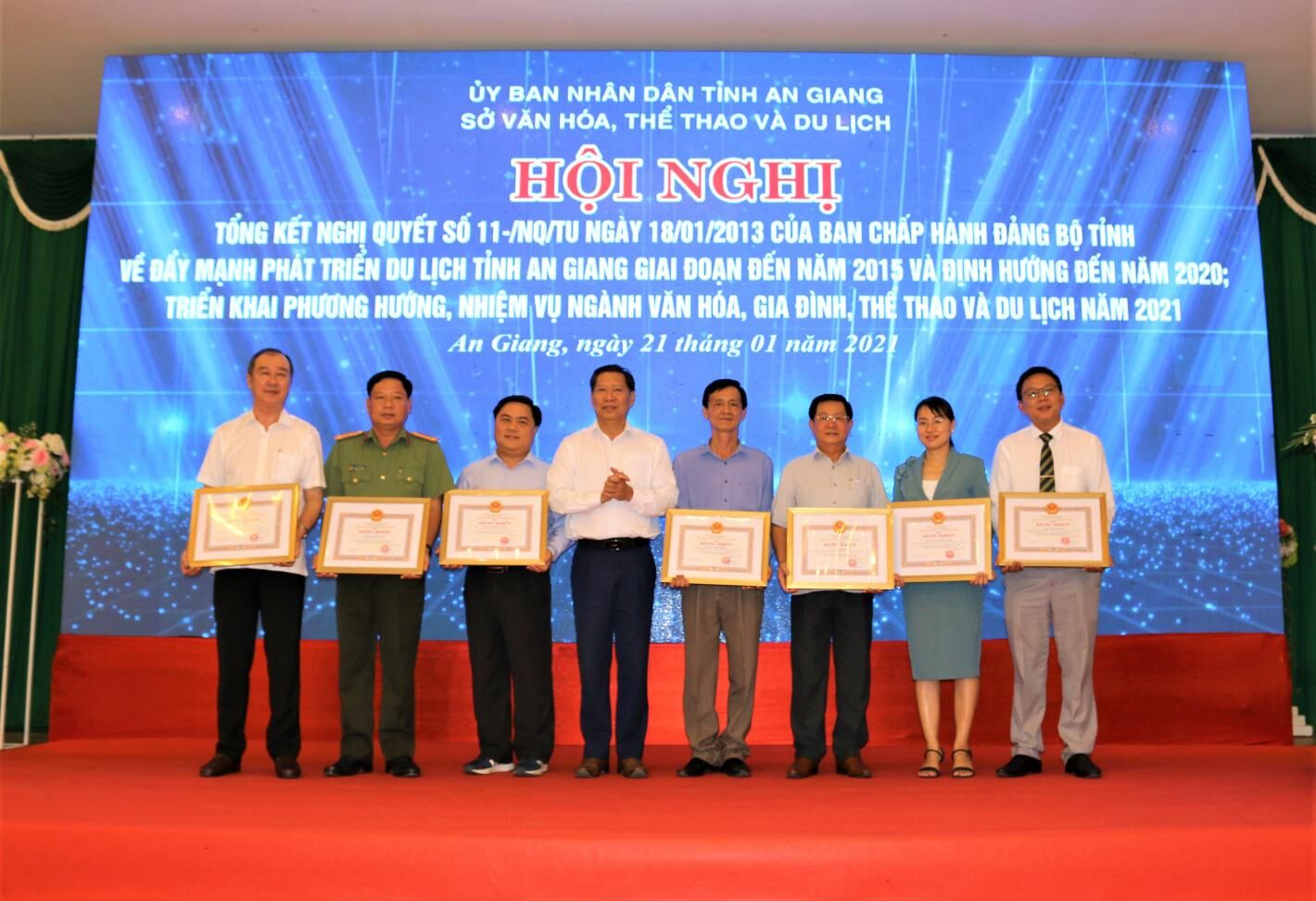 Ông Trần Minh Trí (bìa phải) được Sở Văn hóa, Thể thao và Du lịch khen tặng vì những đóng góp tích cực đối với ngành du lịch tỉnh An Giang.
