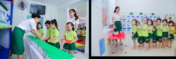 Bên cạnh việc cho các em uống sữa, các thầy cô còn khéo léo lồng ghép những thông điệp bảo vệ môi trường vào hoạt động uống sữa cho các em như: dạy cách gấp dẹp vỏ hộp để dễ thu gom, tái chế; hướng dẫn các em làm ra những mô hình hay đồ chơi từ vỏ hộp sữa rất sáng tạo. Đây cũng là một cách rất thiết thực để giúp các em hình thành ý thức bảo vệ môi trường sống, giảm thiểu rác thải ra môi trường ngay từ lứa tuổi còn rất nhỏ.