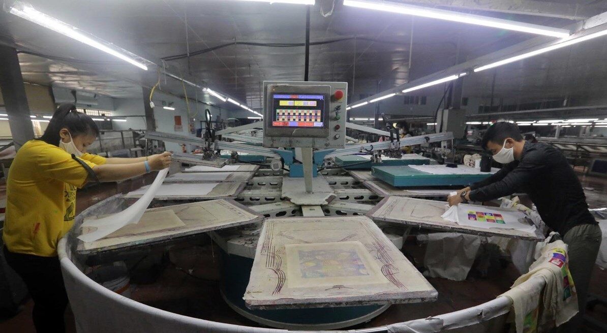 Công ty TNHH An Phú, xã Liêu Xá, huyện Yên Mỹ, tỉnh Hưng Yên có hơn 100 công nhân chuyên thiết kế, gia công in trên các sản phẩm may mặc đã hoạt động cầm chừng, một nửa dây chuyền ngừng hoạt động, công nhân làm việc cách nhật để duy trì cuộc sống. Ảnh: TTXVN