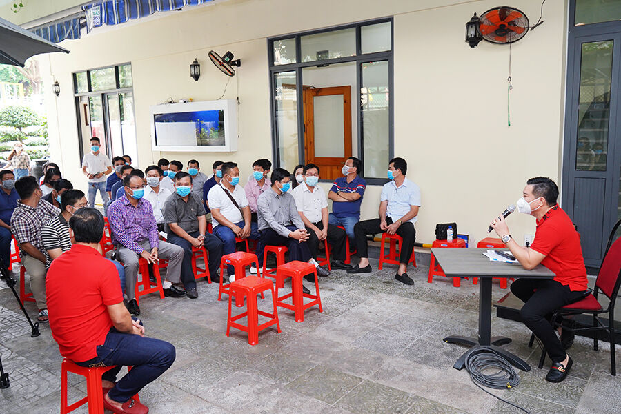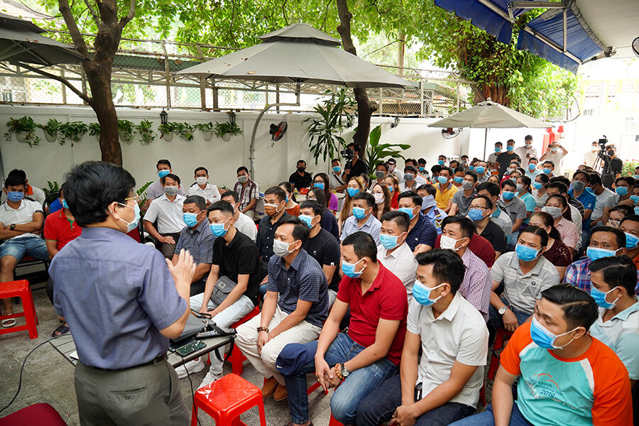 Bên cạnh những thông tin về dịch bệnh của bác sĩ Nguyễn Đức Công, ông Nguyễn Đình Trung - Chủ tịch Tập đoàn Hưng Thịnh, cũng trực tiếp tham gia chia sẻ cùng lãnh đạo các phòng ban để có những biện pháp phòng dịch triệt để.