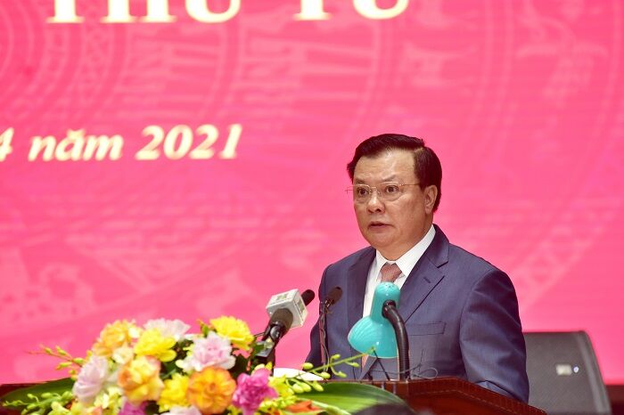 Bí thư Thành ủy Hà Nội Đinh Tiến Dũng phát biểu kết luận hội nghị (Ảnh: cổng Giao tiếp điện tử Thành phố Hà Nội)