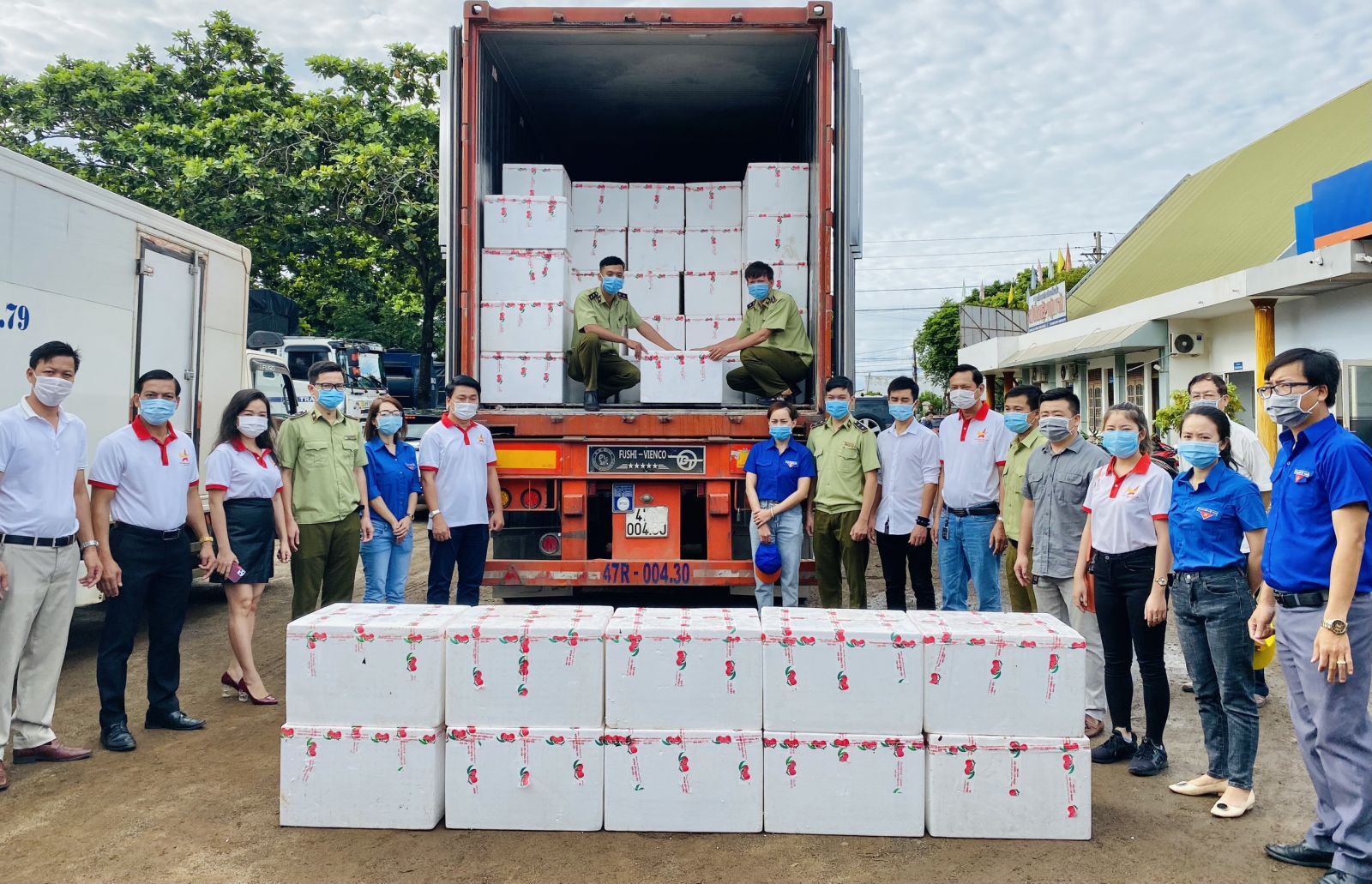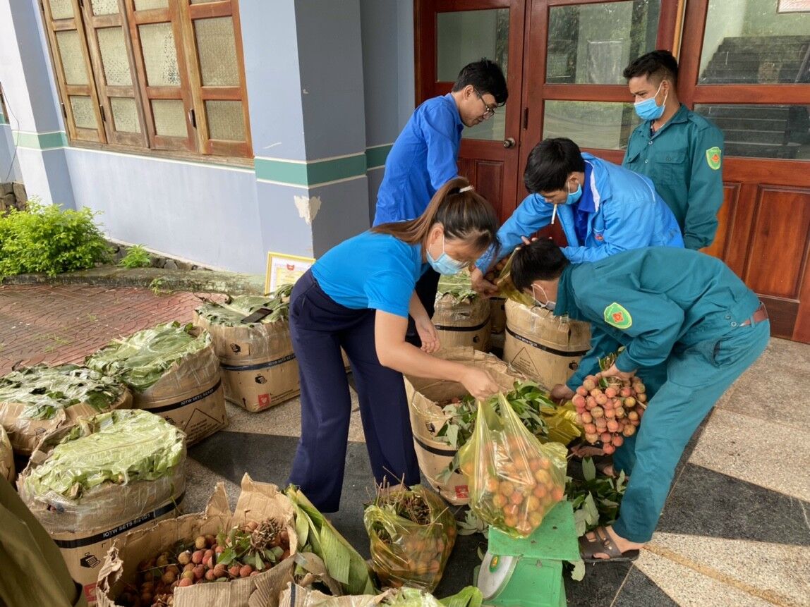 Đoàn viên thanh niên huyện biên giới Ia H'Drai chung tay hỗ trợ tiêu thụ vải thiều Bắc Giang (Ảnh: HL).