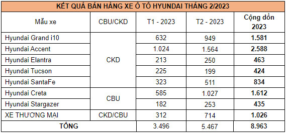 Doanh số bán hàng các mẫu xe Hyundai trong tháng 2/2023 (Đơn vị: Xe)