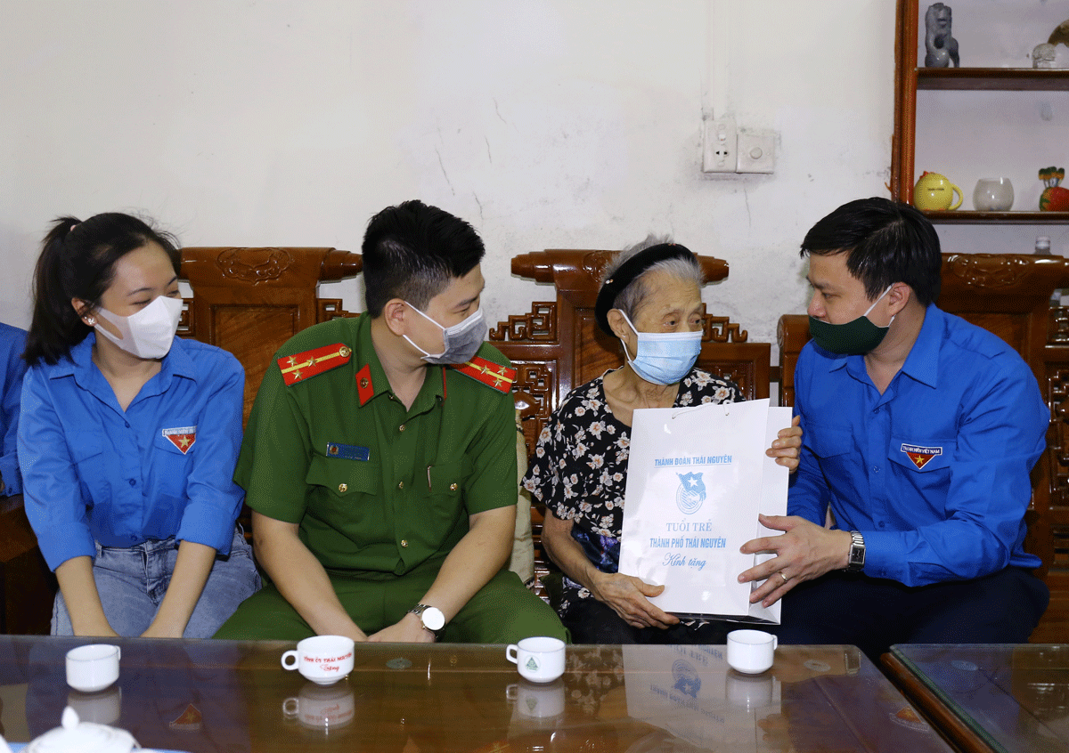 Đoàn viên, thanh niên T.P Thái Nguyên thăm, tặng quà bà Đồng Thị Hạnh, cán bộ lão thành cách mạng, ở tổ 6, phường Hoàng Văn Thụ (T.P Thái Nguyên).
