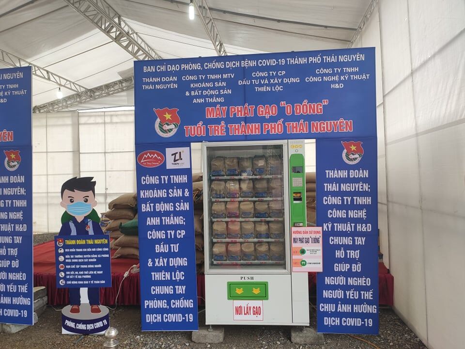 Trước tình hình khó khăn do ảnh hưởng của dịch bệnh COVID-19, Thành đoàn Thái Nguyên phối hợp cùng Công ty TNHH MTV Khoáng sản và Bất động sản Anh Thắng, Công ty CP Đầu tư và Xây dựng Thiên Lộc, Công ty TNHH Công nghệ kỹ thuật H&D và các đơn vị, tổ chức, các mạnh thường quân đã triển khai lắp đặt máy phát gạo miễn phí tại tại số 471, đường Phan Đình Phùng, thành phố Thái Nguyên. Với thông điệp "Chia sẻ yêu thương - Để không ai bị bỏ lại phía sau" máy phát gạo miễn phí này nhằm góp phần sẻ chia gánh nặng với những người lao động nghèo, người có hoàn cảnh khó khăn, nhất là khi dịch bệnh COVID-19 đang có những diễn biến phức tạp, ảnh hưởng nghiêm trọng đến đời sống của người dân. Mỗi người dân một ngày sẽ được nhận một phần gạo hỗ trợ là 3kg. Thời gian tặng gạo vào buổi sáng từ 8h - 10h30 và buổi chiều từ 14h – 16h30. Dự kiến chương trình diễn ra đến hết ngày 24-4.