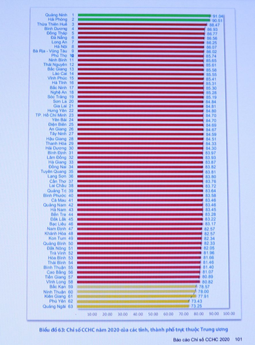 Theo công bố tại Hội nghị, kết quả Chỉ số cải cách hành chính năm 2020 các bộ, ngành tập trung vào 2 nhóm điểm: Nhóm thứ nhất đạt trên 90% gồm 3 đơn vị: Ngân hàng Nhà nước Việt Nam, Bộ Tài chính, Bộ Tư pháp; nhóm thứ hai đạt từ 80% đến dưới 90% gồm 14 đơn vị còn lại.