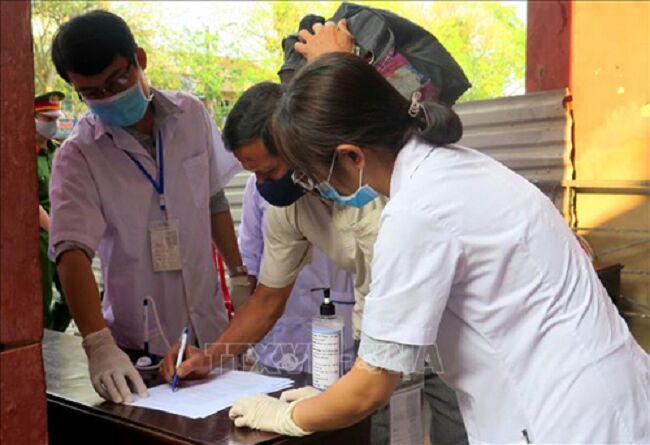 Sinh viên hướng dẫn người dân khai báo y tế tại chốt kiểm soát y tế Ga Huế (Ảnh: TTXVN)