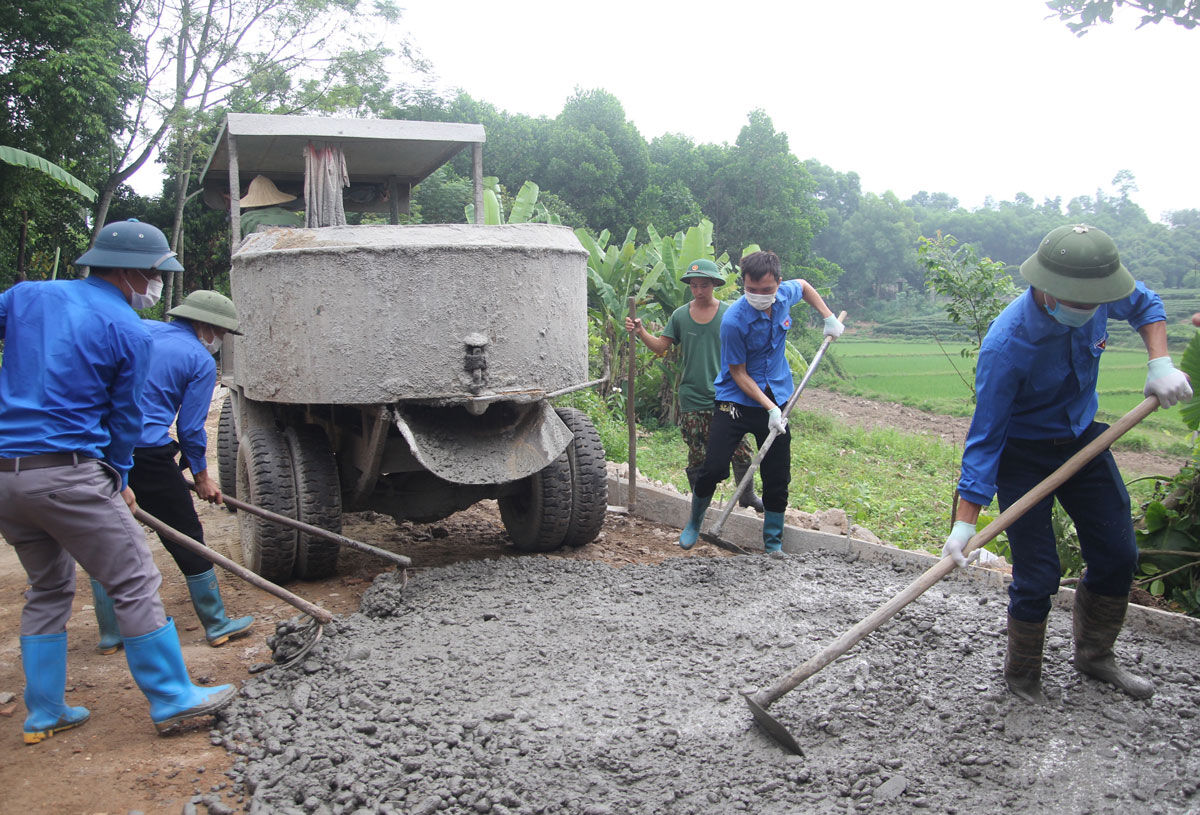 Đoàn viên, thanh niên các đơn vị tham gia xây dựng đường bê tông hỗ trợ gia đình ông Nông Thanh Sơn, xóm Nhân Hòa, xã Thịnh Đức.