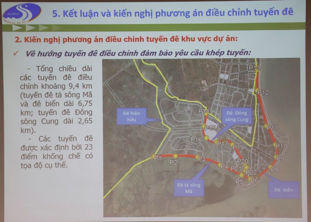Theo phương án do đơn vị tư vấn xây dựng, về phương án điều chỉnh tuyến đê sẽ có 2 hạng mục chính, gồm: phương án đảm bảo an toàn thoát lũ và phương án điều chỉnh tuyến đê khu vực dự án. Trong đó, phương án điều chỉnh tuyến đê khu vực dự án sẽ có các kiến nghị chính như: hướng tuyến đê đảm bảo yêu cầu khép tuyến; phân cấp các tuyến đê điều chỉnh; cao trình các tuyến đê điều chỉnh; khả năng ảnh hưởng của công trình đến thoát lũ hệ thống sông Mã; khả năng ảnh hưởng của công trình đến phòng chống bồi lắng, xói lở bờ sông, bờ biển và an toàn đê điều; kiểm tra, đánh giá đề xuất hướng tuyến đê điều chỉnh nhằm đảm bảo phù hợp, đảm bảo ổn định chống lũ, bão lâu dài.