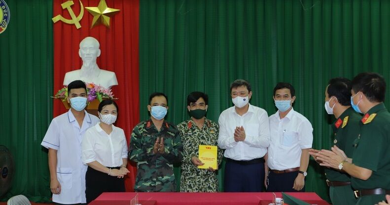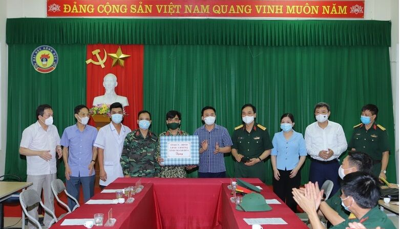 Đồng chí Bí thư Tỉnh ủy Đỗ Trọng Hưng và các đồng chí lãnh đạo tỉnh tặng quà động viên cán bộ, bác sĩ, chiến sĩ đang thực hiện nhiệm vụ tại Trung tâm Giáo dục Quốc phòng - An ninh.