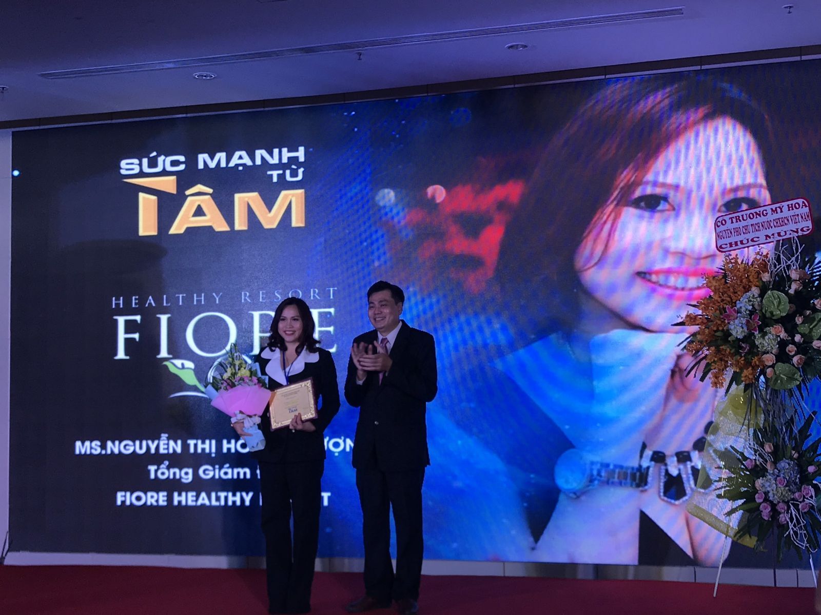 Ông Dương Công Đức, thay mặt BTC tặng hoa và biểu trưng cảm ơn Nhà tài trợ Kim Cương - Fiore Group và Bà Nguyễn Thị Hồng Phượng – Chủ đầu tư kiêm Tổng Giám Đốc Fiore Healthy Resort.