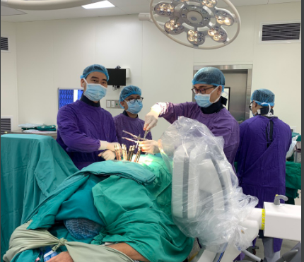 ThS.BS. Kiều Quang Thuận (ngoài cùng bên trái) cùng ekip tham gia phẫu thuật cột sống cho người bệnh.
