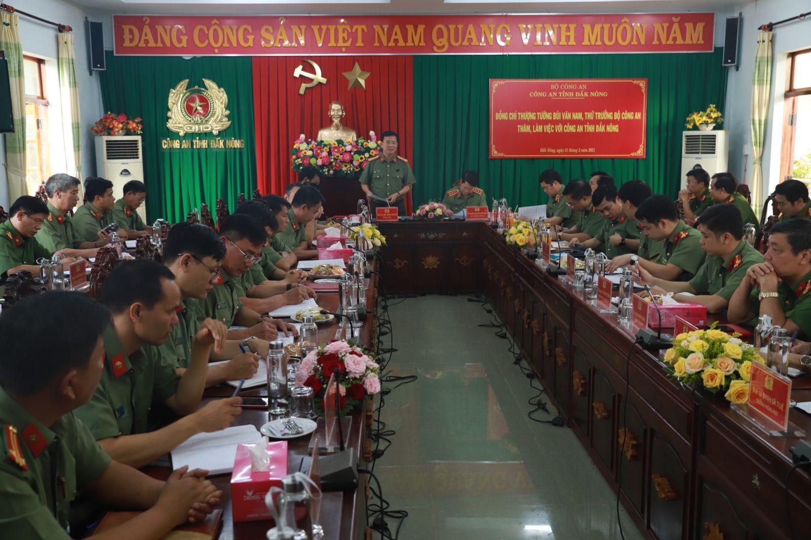 Thượng tướng Bùi Văn Nam, Thứ trưởng Bộ Công an ghi nhận, biểu dương và đánh giá cao về kết quả đạt được cũng như những cách làm hay, sáng tạo của Công an tỉnh Đắk Nông tại buổi đến thăm và làm việc vào ngày 31/3.