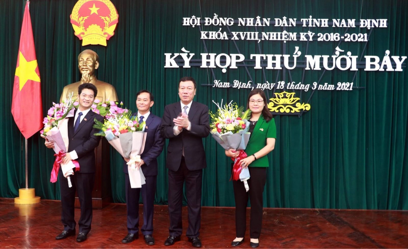 Trước đó, sáng 18/3, tại kỳ họp thứ 17, HĐND tỉnh Nam Định khóa XVIII đã bầu bổ sung ông Trần Anh Dũng (sinh năm 1974, quê quán huyện Mỹ Lộc, tỉnh Nam Định), Giám đốc Sở Kế hoạch và Đầu tư tỉnh Nam Định giữ chức Phó Chủ tịch UBND tỉnh Nam Định; bầu bà Hà Lan Anh (sinh năm 1976, quê quán huyện Ý Yên, tỉnh Nam Định), Giám đốc Sở Công thương tỉnh giữ chức Phó Chủ tịch UBND tỉnh.